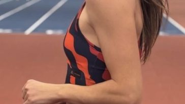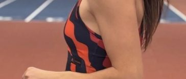 Alessia wearing her blue themed skeleton suit warming up before her run.